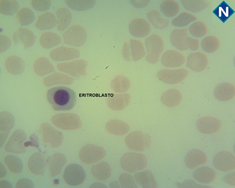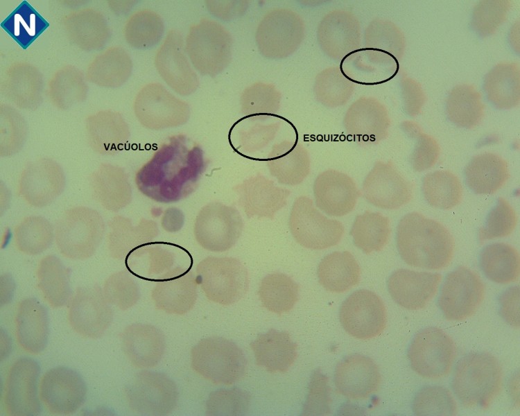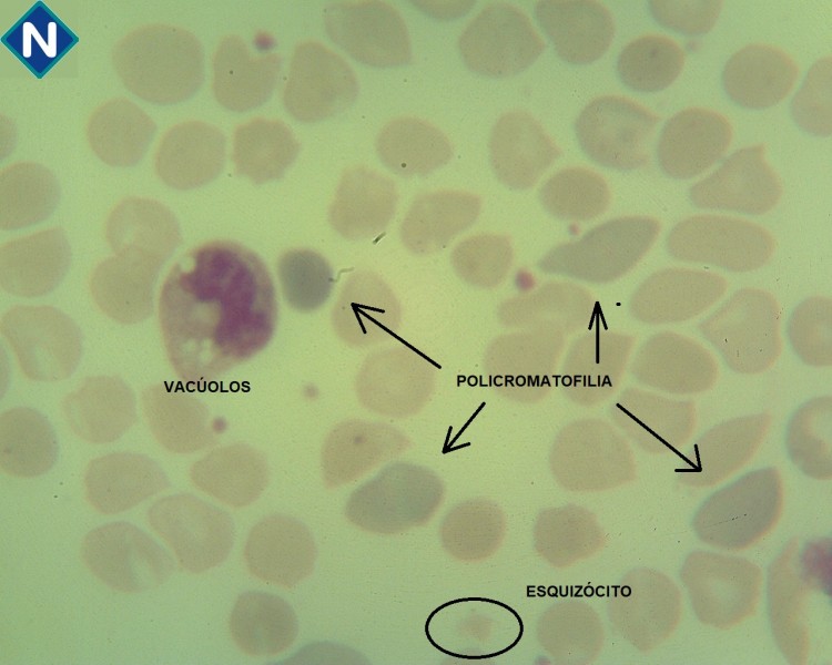 Foi caracterizado, até o momento, o quadro de um processo infeccioso bacteriano agudo. A série vermelha mostra a presença de policromatofilia (++). A associação da policromatofilia com os eritroblastos, que estão no sangue periférico em um número bastante significativo, sugere um quadro hemolítico. Também chama a tenção a presença de esquizócitos (++). O esquizócito quando associado a policromatofilia e aos eritroblastos também sugere um quadro hemolíco. A policromatofilia significa reticulocitose, o reticulócito é um eritrócito jovem com grande conteúdo de RNA e que é maior que o eritrócito maduro (geralmente é 25% maior que o eritrócito maduro), isto explica o aumento do VCM (109,5). O aumento do VCM por reticulocitose chama-se pseudomacrocitose.