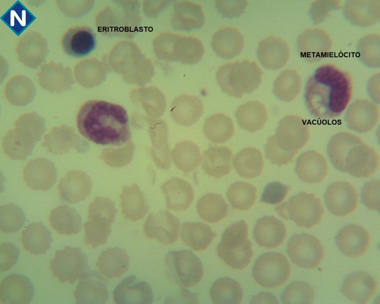 Em um primeiro momento, o que chama a atenção no resultado do hemograma é a grande quantidade de eritroblastos (47). Atualmente, alguns analisadores hematológicos conseguem fazer a distinção entre células brancas nucleadas e células vermelhas nucleadas. O analisador utilizado para a confecção deste hemograma não o faz, então, deve-se corrigir o número de leucócitos. A contagem corrigida de leucócitos foi de 8.979 leucócitos/microlitro. A contagem diferencial mostra a presença de granulócitos imaturos, de granulações tóxicas e de vacúolos. A associação de granulócitos imaturos com granulações tóxicas e vacúolos caracteriza um hemograma infeccioso. Foi encontrado, inclusive, um blasto, o que não é comum em processos infecciosos. Este hemograma é característico de um processo infeccioso bacteriano agudo. Como o número de leucócitos está dentro valor de referência (8.979), pode-se dizer que o quadro infeccioso é compatível com uma produção (medula óssea) igual que o consumo (tecido).