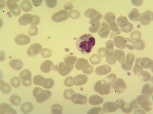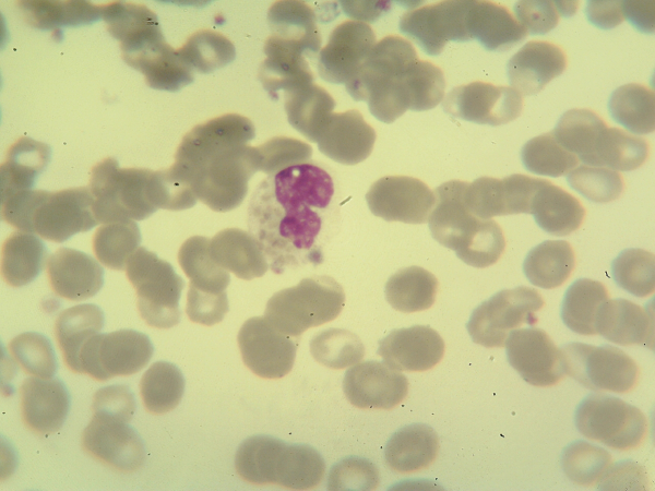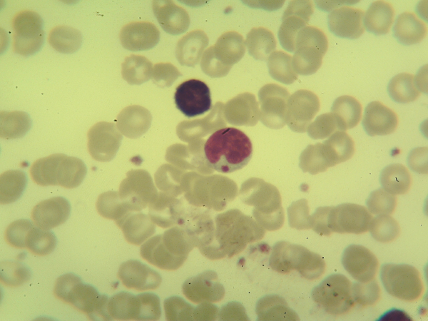 Com base nos alarmes do equipamento, resultado do hemograma e nas fotos da extensão sanguínea indique a hipótese diagnóstica laboratorial e faça uma breve discussão sobre sua escolha.
